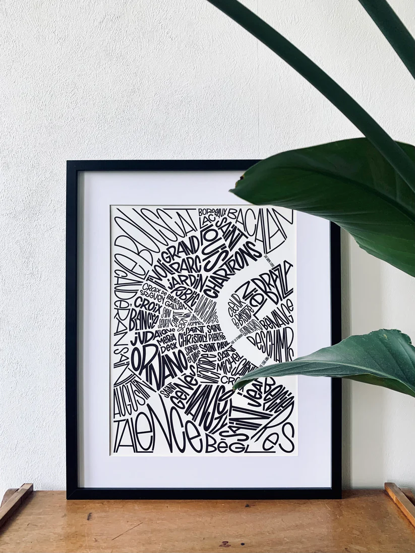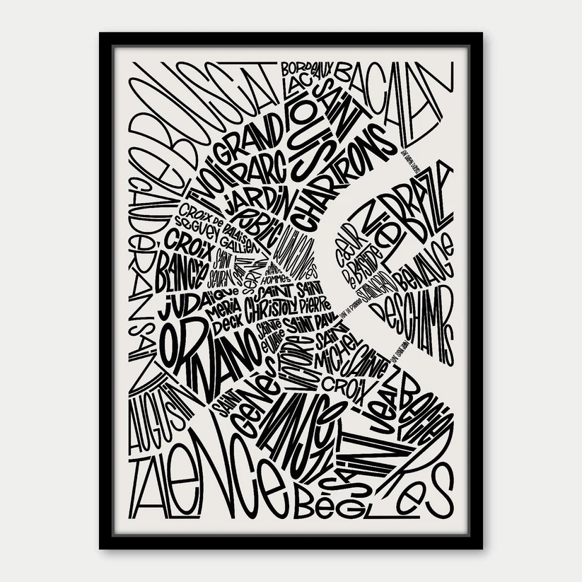 L’affiche quartiers de Bordeaux propose une lecture graphique et contemporaine de la ville. Elle transforme les noms de quartiers en cartographie visuelle.