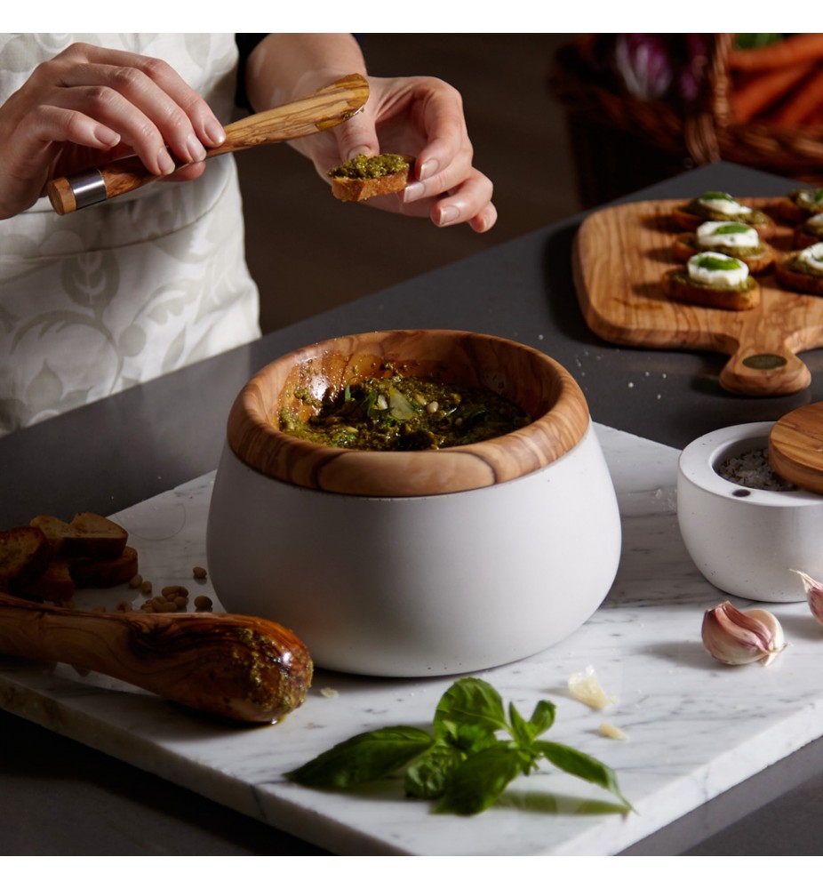Ce mortier en bois d’olivier et béton pour piler des aliments s’utilise aussi bien en cuisine qu’à table.