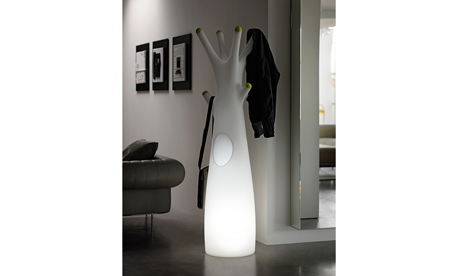 En version lumineuse, le portant à vêtements design Godot crée une atmosphère féérique. La lumière met en valeur ses lignes organiques.