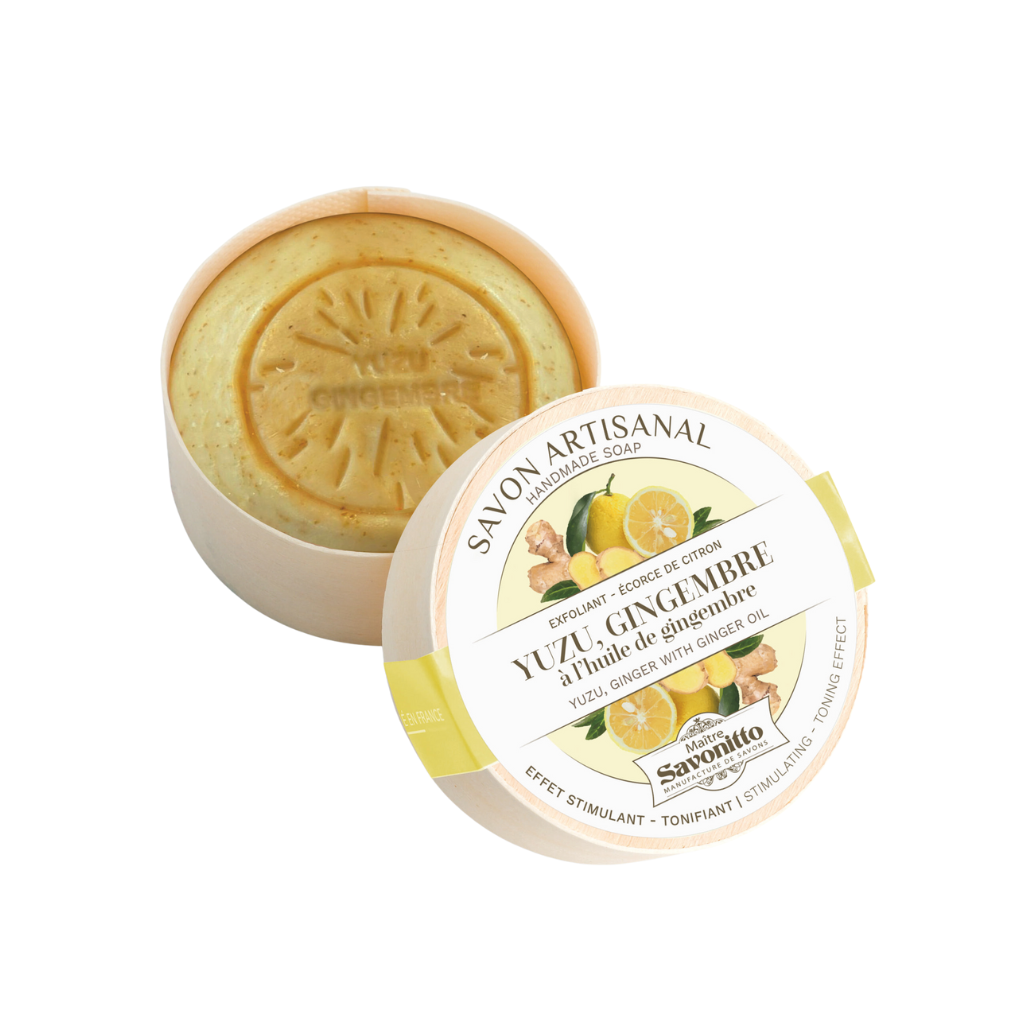 Le savon yuzu et gingembre avec exfoliant en boite en bois offre un soin tonifiant et sensoriel.